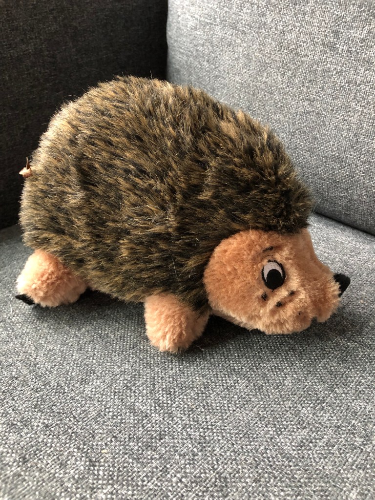 I got him a squeaky hedgehog — I was certain this would be a game changer, because the hedgehog was a favorite of our last two dogs. As I stood there squeaking it gleefully in front of him he looked at me with what I could only describe as an expression of either WTF is she doing? or I pity this poor human who thinks that squeaking fuzzball is interesting. I wasn’t sure.