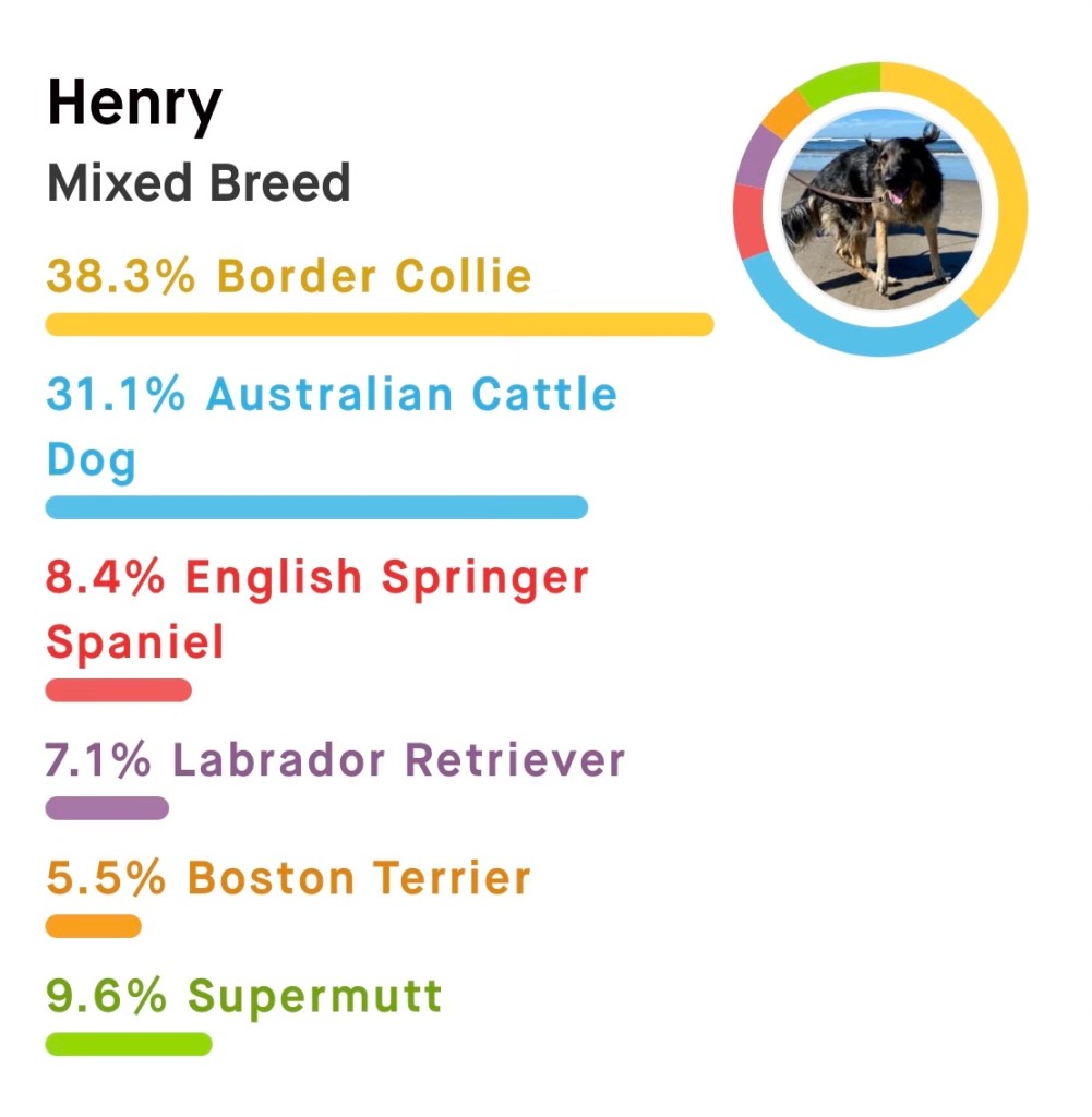 With so much Border Collie and Cattle Dog, we were puzzled that he showed no interest nor aptitude for chasing balls or fetching anything at all. Perhaps he’d never had the chance? We took Henry to the beach several times and never brought a ball (we just didn’t think about it, after all, he wouldn’t fetch anything at home). We did try throwing sticks — again we got that I just found that great stick, why did you throw it down the beach look.