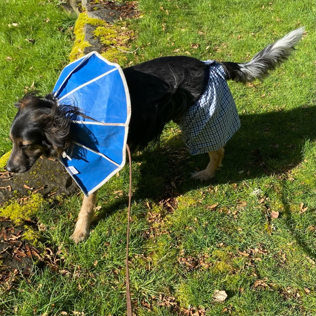 There’s no way to bandage the wound where it’s located. So we fashioned some boxer shorts with velcro waist straps and lined them with pantyliners. His tail goes out the fly. He doesn’t seem to mind them at all, and he looks pretty stylish, particularly when his cone flips inside out and looks like a matching cape. Compared to the casts and lift harnesses he had for his leg surgeries, boxers and a cone/cape are pretty easy, I guess.