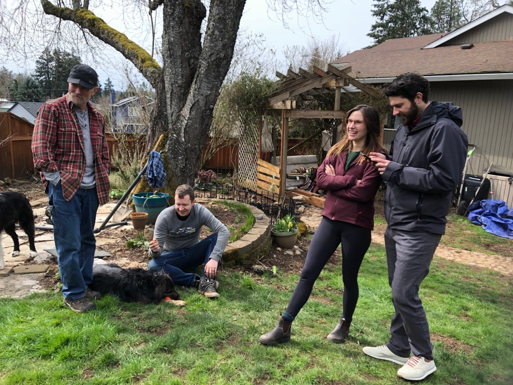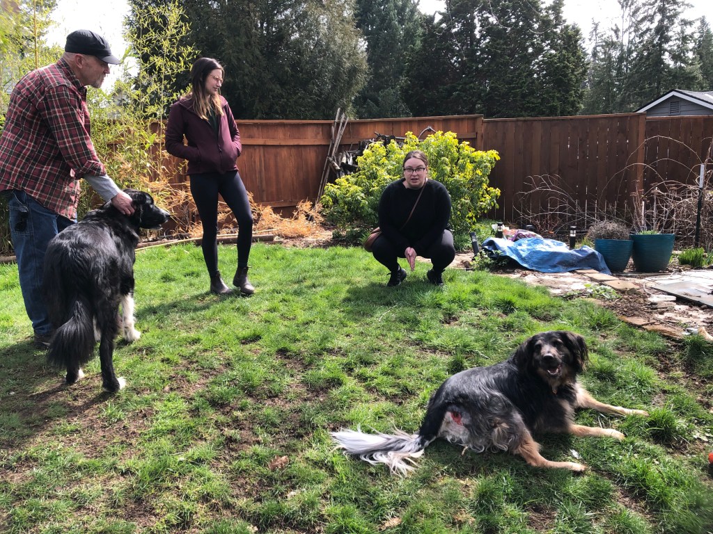 On Monday we gathered, for the first time since Henry (Blue Valentine)’s adoption day, with his wonderful foster couples from One Tail at a Time Portland and his adoption counselor, April. Mimi and Peter were the people who cared for Henry throughout most his complex leg surgeries and convalescence two years ago, and Justin and Gabie had been fostering him for several weeks just before we adopted him. We all met in Justin and Gabie’s back yard (Gabie is out of town, so she joined by video). Henry’s former foster dog brother, Spock, was there too.