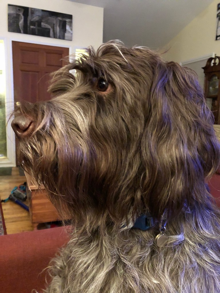 As it happened, a friend from the Wirehaired Pointing Griffon rescue community was looking to re-home one of her three dogs. She was facing some health challenges that made it difficult for her to deal with that many big, rambunctious dogs. She reached out to us, knowing we’d had Wirehaired Pointing Griffons before (we know the quirks of the breed), and asked if we would consider being a new home for Mack (Mackie) — her 3.5-year-old Griff she’d taken in as a rescue when he was 6 months old.
