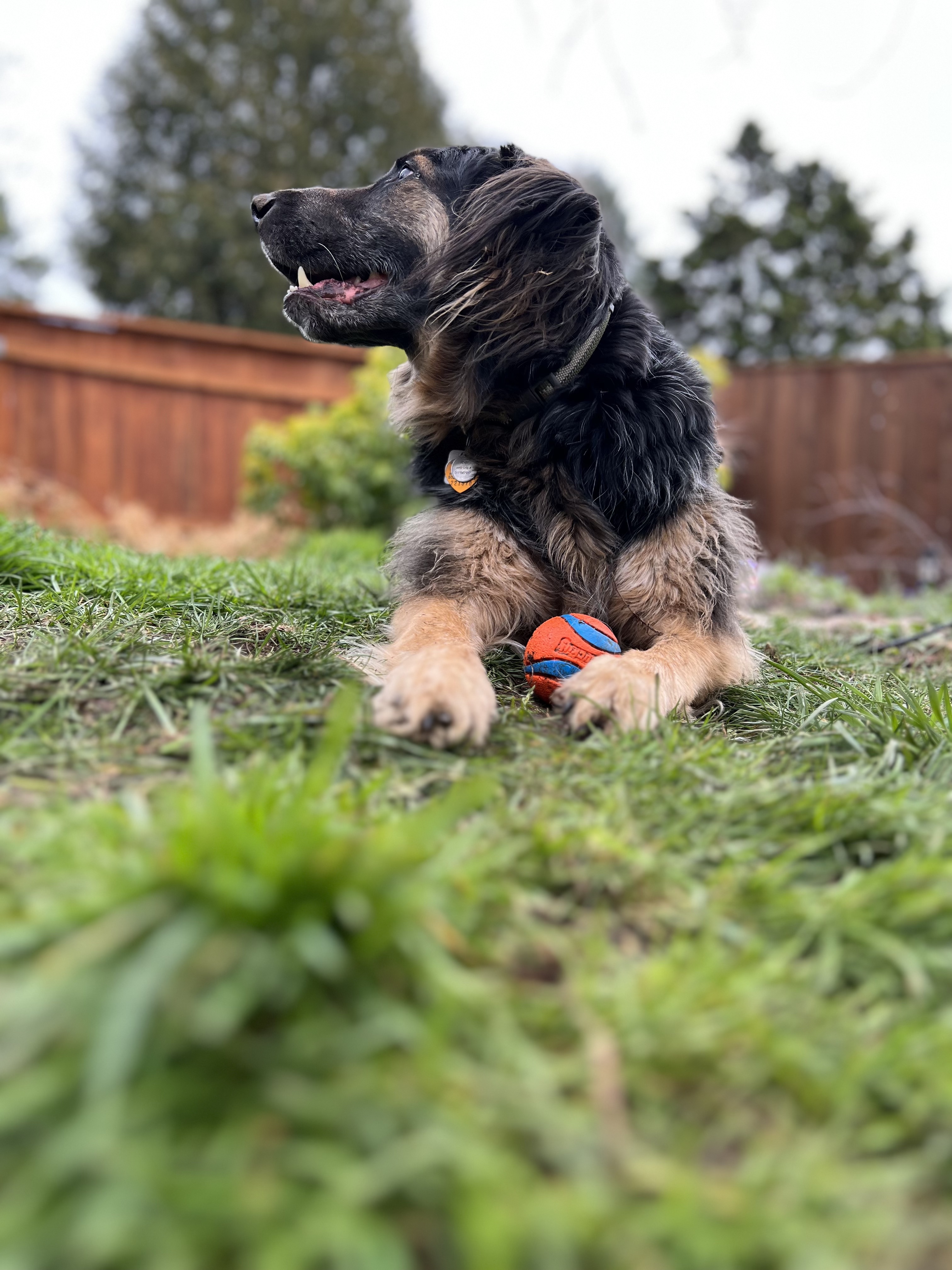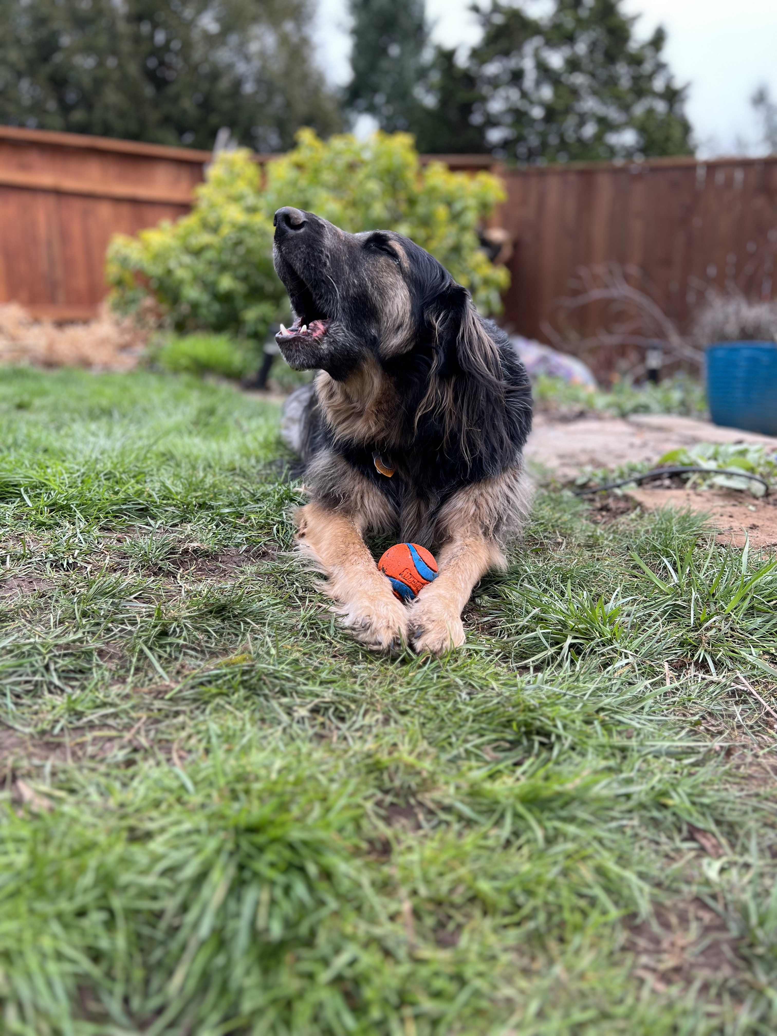 Henry amused himself with his ball for a couple of hours as the humans caught up on dog and human history.