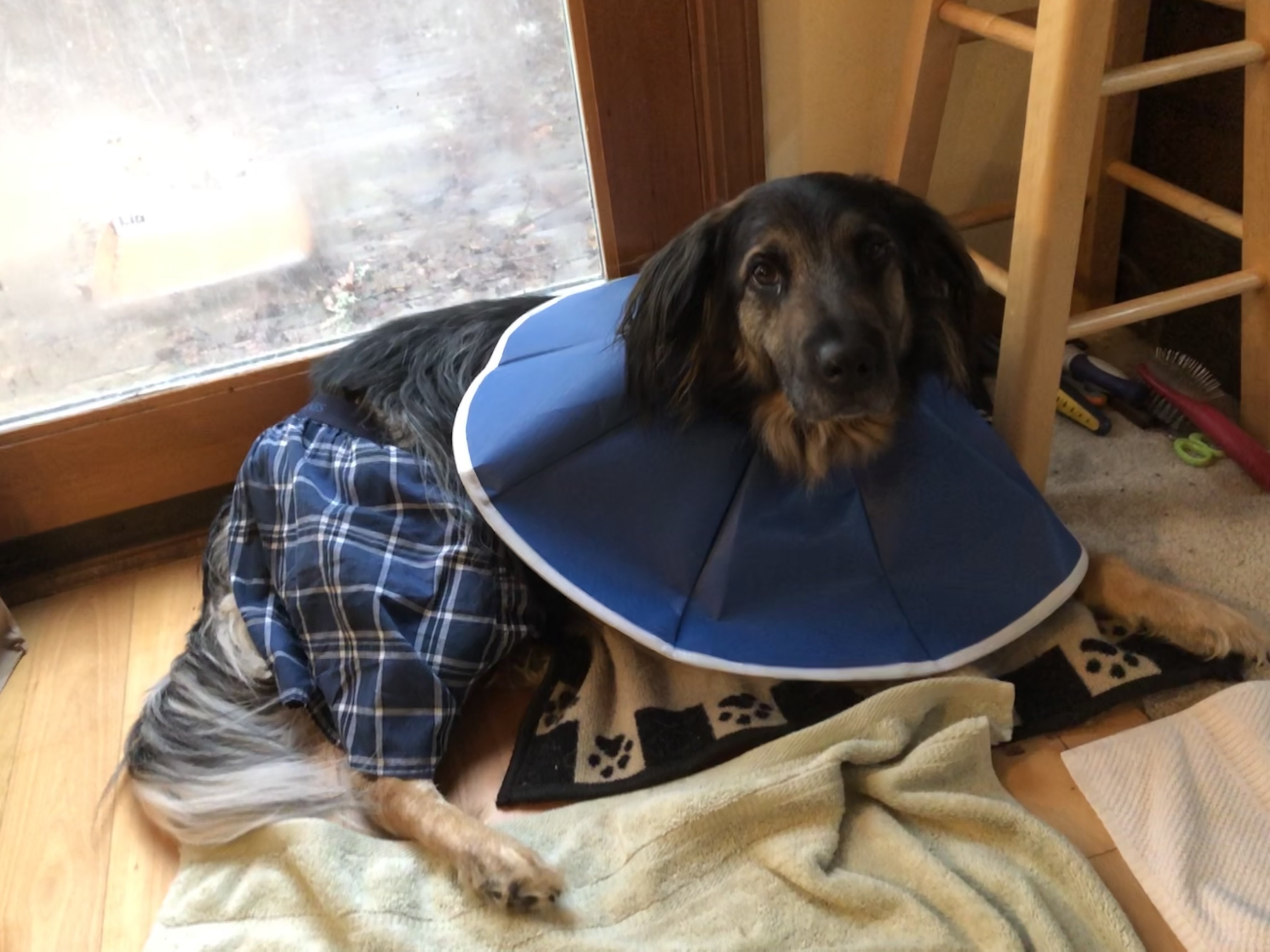 There’s no way to bandage the wound where it’s located. So we fashioned some boxer shorts with velcro waist straps and lined them with pantyliners. His tail goes out the fly. He doesn’t seem to mind them at all, and he looks pretty stylish, particularly when his cone flips inside out and looks like a matching cape. Compared to the casts and lift harnesses he had for his leg surgeries, boxers and a cone/cape are pretty easy, I guess.