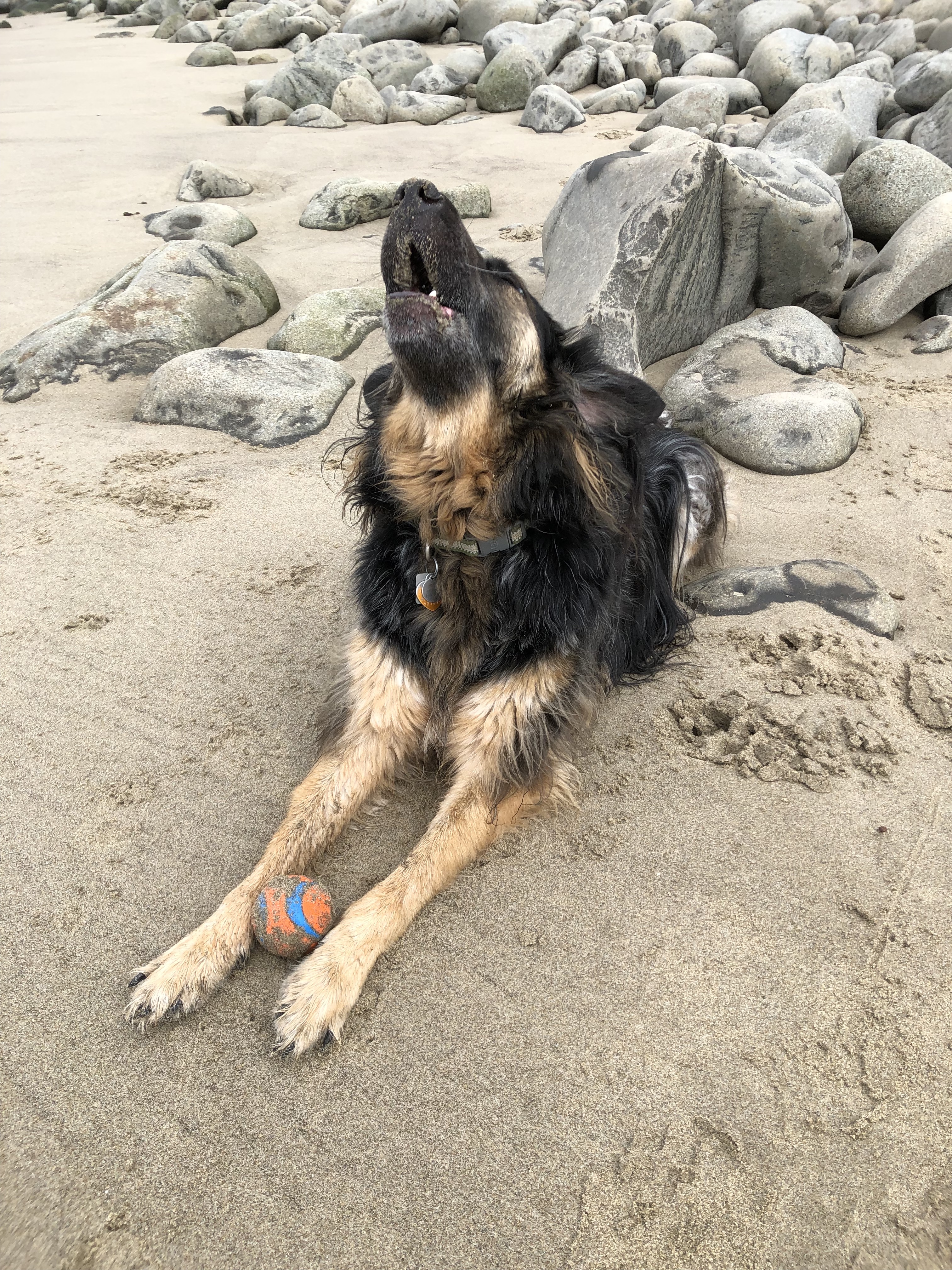 Henry has honed his ball handling skills over our many beach visits in the last six months, digging his “dogapults,” dribbling like Messi on sand and in water (slightly different skill set) and kicking the ball out behind him so he can chase it, catch it and start all over. He particularly enjoys the incoming tide, because it makes the ball dance and run up the beach all by itself. So he now positions himself, looks back at the water and kicks it into the incoming waves.