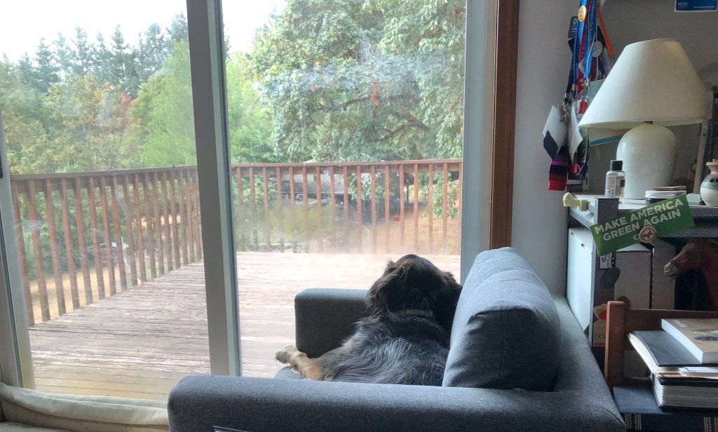 August 16 passed without a great deal of fanfare, but we celebrated Henry’s gotcha day with extra love, scratches, cuddles and cookies, and that seemed to suit Henry just fine. It has been extremely hot here of late. As I spent the day working in my office, Henry settled into in the chair across from me — which also happens to be right over an air conditioning vent — looking out at the happenings in the yard. Henry definitely knows how to chill.