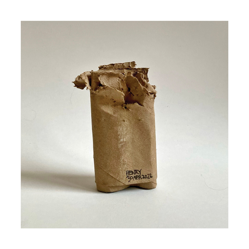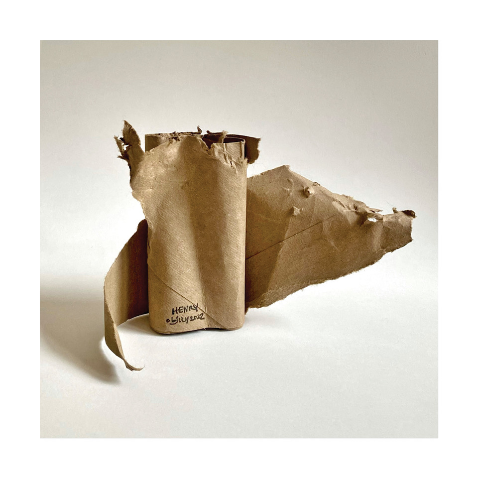We discovered Henry Blue’s artistic spirit when he showed an outsized interest in cardboard toilet paper tubes. Preferring the “nested” variety, with multiple layers of tube, he carefully tears away the cardboard with his front teeth, layer by layer, stopping just shy of complete destruction. He takes a moment to consider each piece, instinctively knowing when it is done, and walks away.