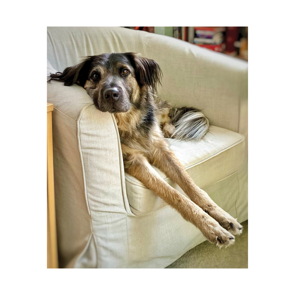 Henry (previously known as Blue Valentine) was found as a wandering stray in SW Washington State. He’d been walking on two broken front legs. Nobody knew his story. Barely avoiding euthanasia, he was taken in by an amazing rescue organization, One Tail at a Time, in Portland, Oregon. There, through the care of many people, he was mended and fostered through several operations and attendant recoveries. Once fully healed, Henry was adopted and came to be the unbounded creative talent he is today.
