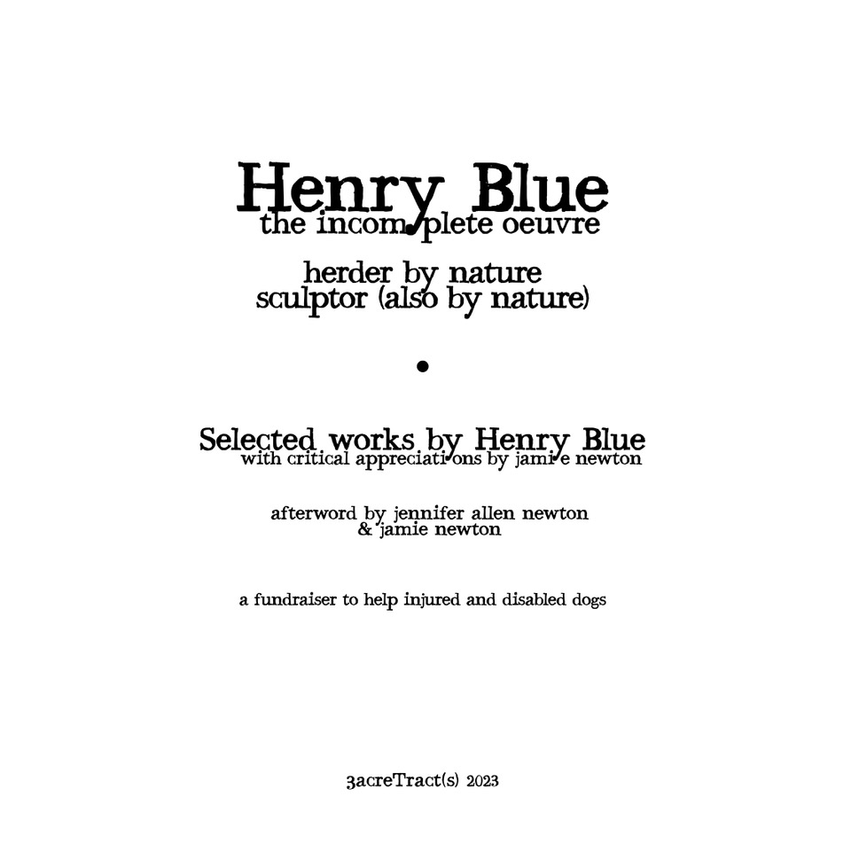 This 72-page book features the sculptural & performance work of the superlative canine, Henry Blue. Thirty-one color plates highlight the work while accompanying texts elucidate the finer points of the oeuvre.